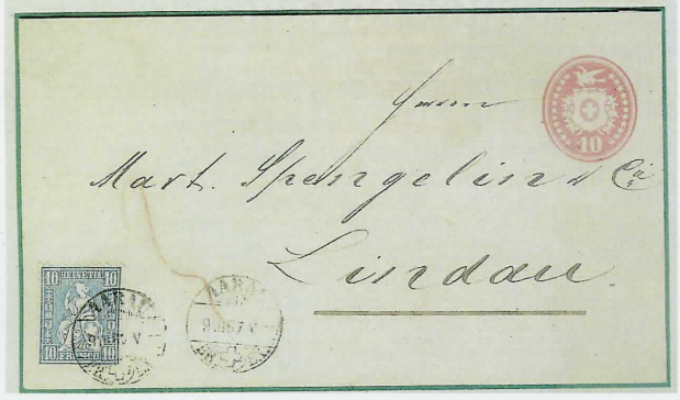 Auf den 1. Juli 1867 (gemäss Bundesbeschluss 16.07.1866) wurde das erste Francocouvert zu 10 Rappen (ZNr. 5) von der Eidg. Postverwaltung herausgegeben. Anderseits wurde auf der Wertzeichenseite wie erwähnt die neuen „Farbänderungen und Wertstufen" der Ausgabe Sitz. Helvetia gez. ab 1867 in Verkehr gesetzt. Die Herausgabe der 10 Rp.-Wertstufe rot (ZNr. 38) erfolgte anfangs März 1867 (FD 4.III.67). Die Blaue 10 Rappen Sitz. Helvetia (Zu.Nr. 31) wurde am l. Oktober 1862 herausgegeben und war 1867 praktisch aufgebraucht.