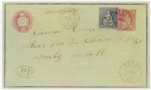 30 Rp. Auslandfrankatur von Grono nach Metz (F) (Tarif 1.10.1865-31.12.1875). Einzig bekannter Tübelibrief (ZNr. 9) mit der Kombination 10 Rp. blau/10 Rp. rot. Der Brief ist restauriert und galt in den letzten Jahrzehnten als nicht immer über alle Zweifel erhaben, (heutiger Besitzer unbekannt)