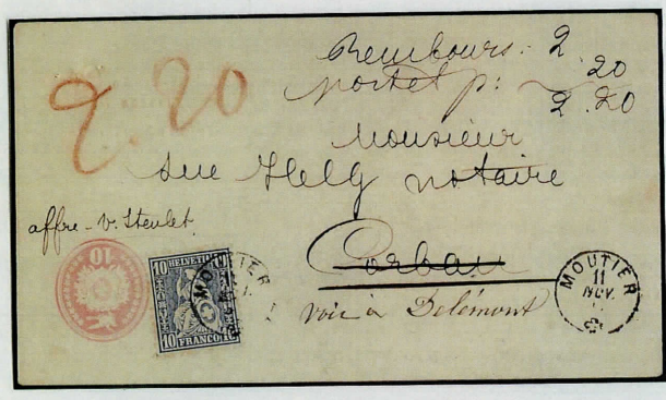 20 Rp. NN-Frankatur von Moutier nach Corban mit Weiterleitung nach Delémont (10 Rp. Porto + 10 Rp. NN-Prov.) (Adresse wie Briefmarke kopfstehend angebracht) (Sammlung Museum für Kommunikation)