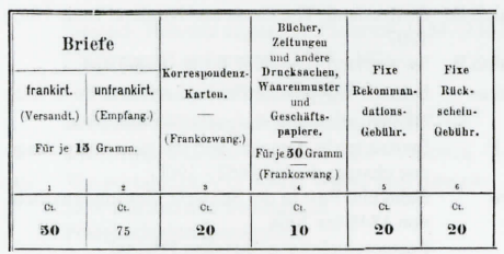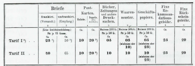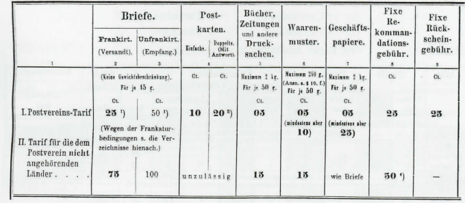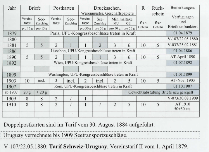 Ab 1. Juli 1892: Die Briefposttarife zwischen allen Ländern, ohne Unterschied, werden dem UPU-Einheitstarif angepasst. Der Unterschied in den Briefposttarifen ist nur noch auf die Seetransportzuschläge zurückzuführen.