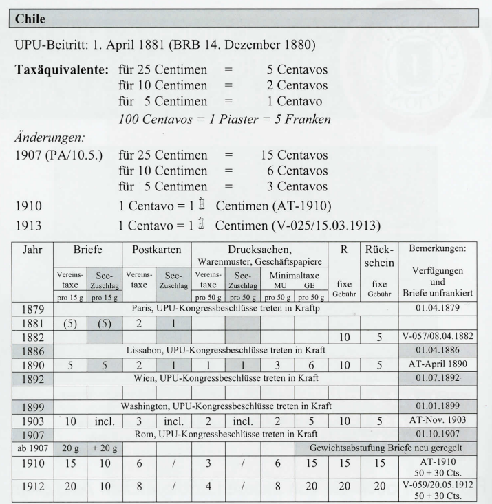 V-138/05.08.1882: Doppelpostkarten im Verkehr mit Chile sind nun zulässig. V-248/27.12.1883: Für die über Panama geleiteten Correspondenzen aus Chile nach der Schweiz werden fortan in Chile die gleichen Zuschlagstaxen erhoben wie solche über Magellan.