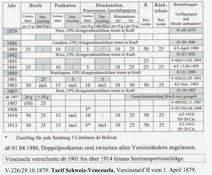 Postvereinstarif II gültig ab 1. Juli 1877, ab Schweiz nach Ländern mit Seetransportzuschlag.