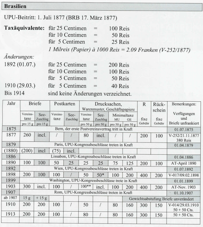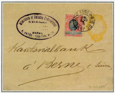 20. Juli 1883: Korrespondenzkarte BRASILIEN-SCHWEIZ, UPU-Taxe 50 Reis + 25 Reis Seezuschlag = Total 75 Reis. Brasilien rundete auf 80 Reis auf, da postalisch nur mit „10er"- Stufen gerechnet wurde. Ein zusätzlicher Gewinn für die brasilianische Postverwaltung. Die UPU-Vorgaben wurden um 5 Reis überschritten, Beleg (1).