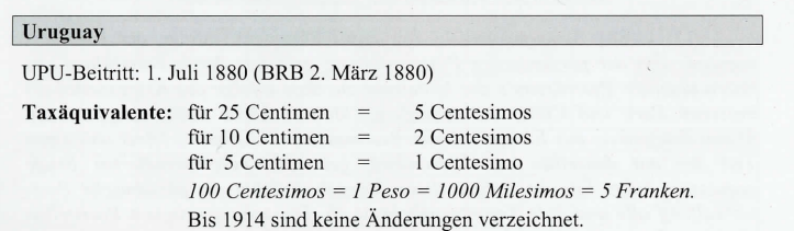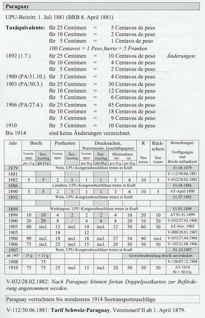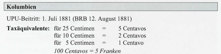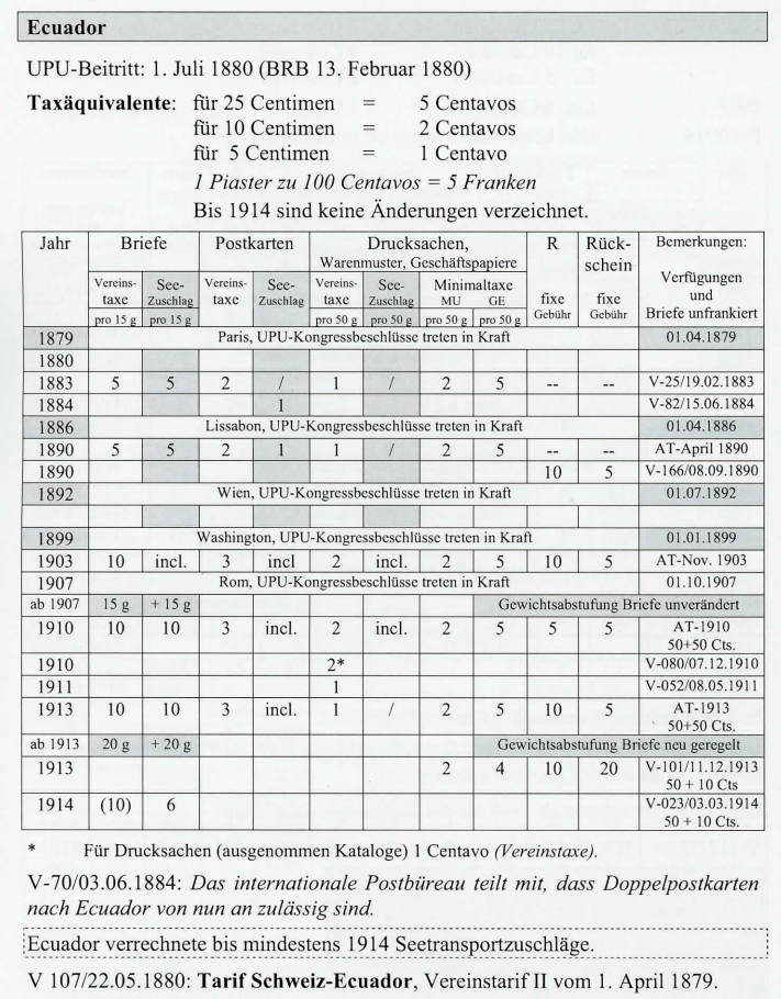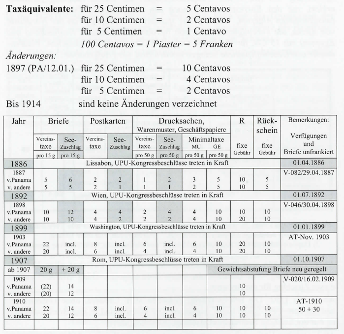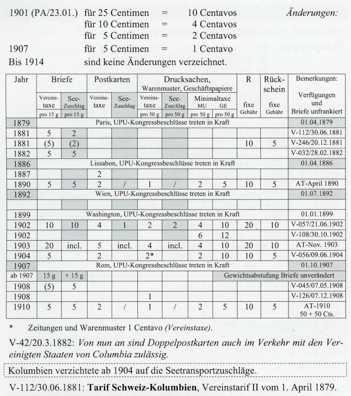** Bei der Beförderung über Panama beträgt die Zuschlagstaxefür Briefe 12 Centavos, für die anderen Sendungen l Centavo (AT-01.01.1899). *** Ohne Rücksicht auf den Leitweg. Abgeändert mit V-149/29.12.1905: Ohne Rücksicht auf den Leitweg für Zeitungen 2 Centavos und für andere Drucksachen über Panama 4 und über andere Wege 2 Centavos.