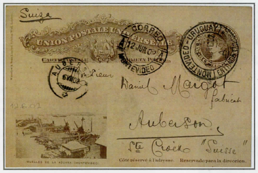 12. Juni 1902: Korrespondenzkarte URUGUAY-SCHWEIZ, UPU-Porto 2 Centesimos + Seezuschlag l Centesimo = total 3 Centesimos, diese entsprechen 15 Centimen, Beleg (1).