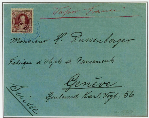 U-Porto 25 Centimos + Seezuschlag 25 Centimos = total 50 Centimos, entspricht genau 50 Centimen. Der Absender verlangte als Leitweg, via Paketboot „FRANCE", Beleg (l).