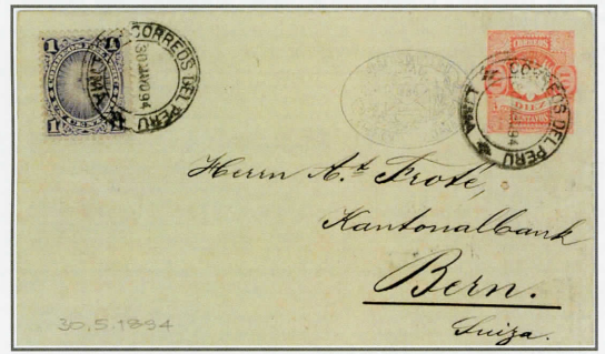 30. Mai 1894: Brief bis 15 Gramm PERU-SCHWEIZ, Leitweg über Panama, UPU-Porto 5 Centavos + 6 Centavos Seezuschlag via PANAMA = total 11 Centavos, diese entsprechen 55 Centimen, Beleg (1).