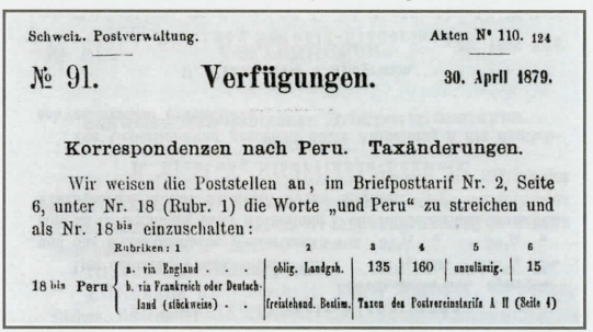V-041/20.03.1882: Briefpostverkehr mit Peru. Mit Bezugnahme auf unsere Verfügung Nr. 211 von 1881 bringen wir den Poststellen behufs allfälliger Auskunftserteilung zur Kenntnis, dass in Lima, Callao und anderen Städten Peru 's mit Ausnahme von Payta (nunmehriger provisorischer Sitz der peruanischen Central Postverwaltung) der Postdienst ausschliesslich unter chilenischer Verwaltung steht.