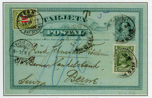 5.Januar 1903: Korrespondenzkarte CHILE-SCHWEIZ, UPU-Porto 2 Centavos, der Seezuschlag von l Centavo (5 Centimen) fehlt, daher in der Schweiz mit 10 Rappen nach taxiert. Berechnung; das fehlende Porto in Centimen mal zwei, Beleg (1).