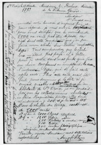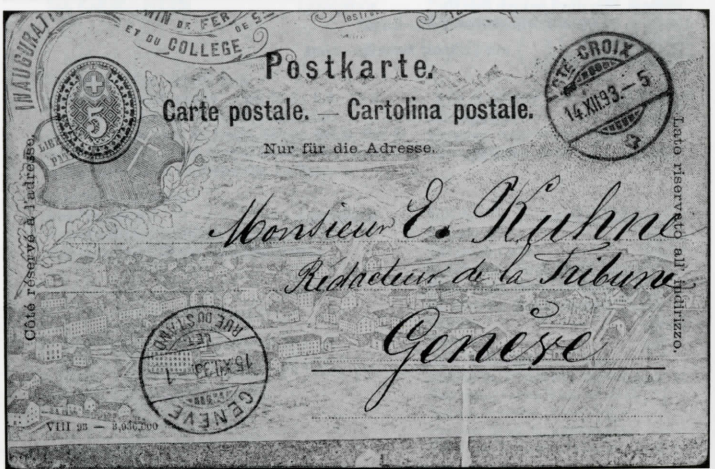 Durch Zufall entdeckte ich kürzlich eine amtliche Postkarte mit privatem Zudruck ZU-Nr. 3 (Ste-Croix), auf deren Rückseite Arnold Klein - der den Zudruck anfertigte — dem Redaktor der Tribüne de Geneve die Auflage mitteilte. Danach teilt sich die gesamte Auflage von 5000 Stück folgendermassen auf: 2000 blau, 1250 dunkelbraun (sepia), 750 violett, 700 hellbraun (bistre) und 300 "couleur photographique", was wahrscheinlich etwa rotbraun entspricht. Den bei Zumstein aufgeführten schwarzen Vordruck erwähnt Klein nicht; möglicherweise handelt es sich um einen Probedruck. Erwähnen möchte ich noch, dass mir auch schon eine Karte mit Auflagevermerk "VI 93-4 044 000" begegnet ist.