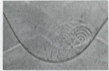 c) Teilweise spiegelbildliche Rosettenprägung, weil während des Prägevorganges die Spitze der Verschlussklappe umgebogen war.