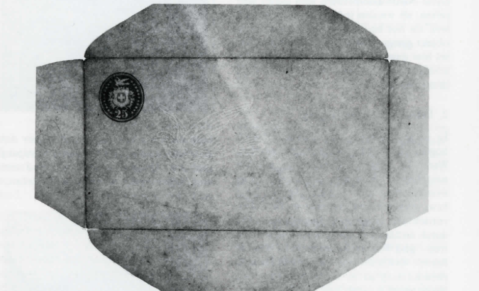 Für unsere Betrachtungen ist es unwesentlich, ob das Papier bereits mit dem eingepressten Kontrollzeichen von der Papierfabrik angeliefert wurde, oder aber dieses in Lausanne geprägt wurde. Im zweiten Arbeitsgang wurde nun das Papier ausgestanzt. Es kann angenommen werden, dass mehrere Papierbogen gleichzeitig in die Stanze gelegt wurden, weil die tieferliegenden Rohlinge manchmal ausgefranst sind. Vor allem bei den Umschlägen 4—1 5 kann man deutliche Unterschiede bei der Form der Schnittlinie erkennen.