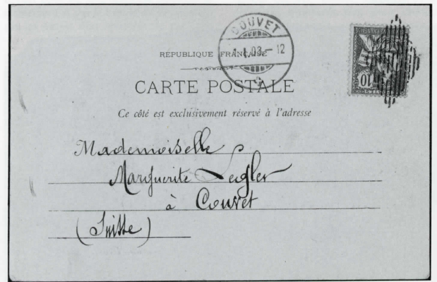 Fig. 5. Carte de Marseille non obliteree au depart. Le bureau de Transit de Geneve a annule le timbre avec la grille federale (carte du Nouvel-An 1903).