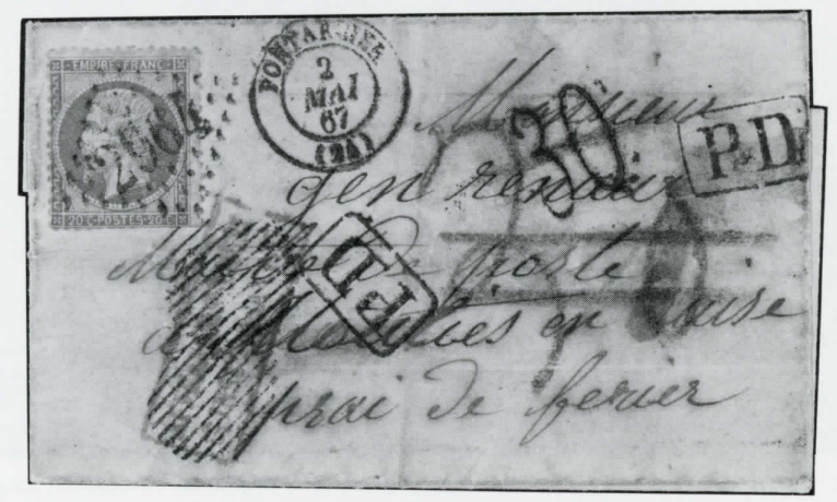 Fig. 9. Lettre du 2 mal 1867 de Pontarlier pour Maliers. Cette lettre du rayon limitrophe portait le cachet affranchissement insuffisant francais et la faxe 30. L'ambulant Pontarlier-Berne agissant en tant que bureau d'echange a frappe 2 fois le PD et annule l'affranchissement insuffisant avec deux frappes de la grille ovale ä 11 barres.