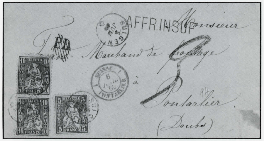 Fig. 7. Lettre de Sulgen du 5 fülltet 1865. Neuchätel a frappe AFFR. INSUF et annule le cachet PD avec sä petite grille ä 8 barres.