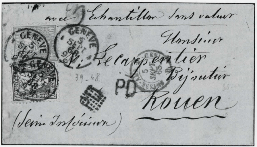 Fig1. Lettre de Geneve du 5.9.68 pour Rouen. Cette lettre affrNCHIE A 3 X le port a ete frappe d'un PD lequel a ete annule par la petite grille ä 36 points de Geneve. Ensuite constatant leur erreur le PD a ete ä nouveau frappe.
