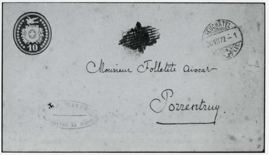 Fig. 8. Entier 10et parti le 30 juillet 1872 pour Porrentruy. Le cachet PD frappe par erreur a ete annule par la petite grille de Neuchätel ä 8 barres.