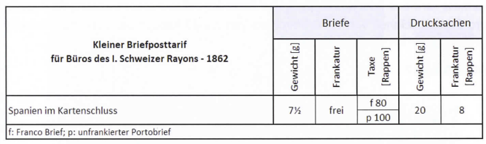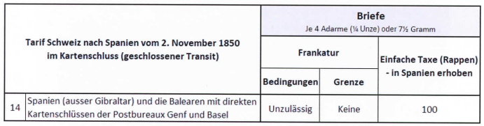 Der Postvertrag zwischen der Schweiz und dem Königreich Spanien vom 2. Nov. 1850 wurde im Januar 1851 ratifiziert. Dies führte zu folgenden Einschränkungen im Tarif: