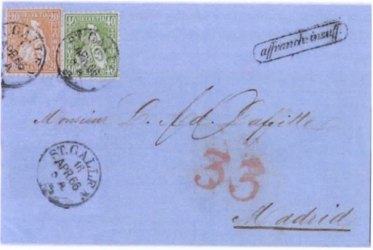 Der Brief aus St. Gallen in Abbildung 24 wurde über Basel nach Madrid geleitet, womöglich über Irun, doch es fehlen Stempel der zwei üblichen spanischen Grenzorte. Die Frankatur von 60 Rappen wäre für einen einfachen Brief bis 7K Gramm korrekt gewesen. Das Gewicht war aber höher. Gemäss der Tabelle 18 wäre eine Frankatur von 120 Rappen richtig gewesen. In St. Gallen wurde der Stempel «affranch. insuff.-». angebracht. Die spanischen Behörden belegten den Brief mit einer Taxe von 33 Cuartos, die vom Empfänger entrichtet werden mussten. Dieser Betrag kam wie folgt zustande. Gemäss Postvertrag betrug das Porto für einen doppeltschweren unfrankierten Brief 6 Reales de Vellön, zu je 8.5 Cuartos (siehe PG Dezember 2024, Vorwort), d.h. 51 Cuartos von denen jedoch 18 Cuartos für die bereits bezahlten 60 Rappen der Frankatur abgezogen wurden (10 Rappen = gerundete 3 Cuartos).