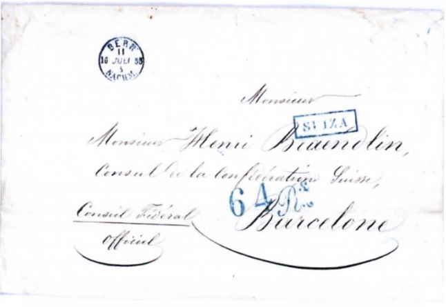Abbildung 18 zeigt einen offiziellen Brief des Bundesrates von Bern über Genf nach Barcelona (Transit- und Ankunftsstempel vom 12. bzw. 15. April auf der Rückseite). Der Brief in der 16. Gewichtsklasse (112,5 -120 Gramm) wurde mit 64 Reales taxiert, was 16 Franken entsprach. Für die damalige Zeit ein Vermögen. Es sind einige Briefe aus dieser Korrespondenz bekannt. Es ist die zweithöchste mir bekannte Taxierung auf Briefen aus der Schweiz nach Spanien.