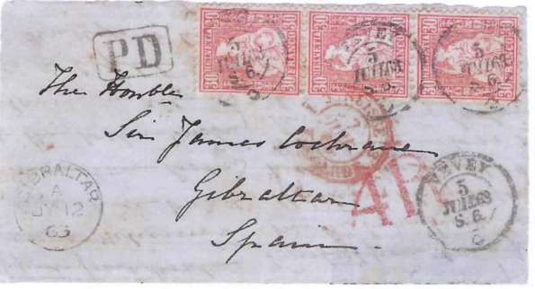 Wie Tabelle 15 zeigt, bestanden zwei Möglichkeiten Briefe aus der Schweiz nach Gibraltar zu schicken: entweder über den üblichen Landweg oder mittels britischen Paketboten. Aus der Zeit vor der UPU sind bisher lediglich zwei Briefe aus der Schweiz nach Gibraltar bekannt. Beide wurden gemäss Tarif für den Transport mit englischen Schiffen frankiert, doch keiner wurde per Schiff befördert.