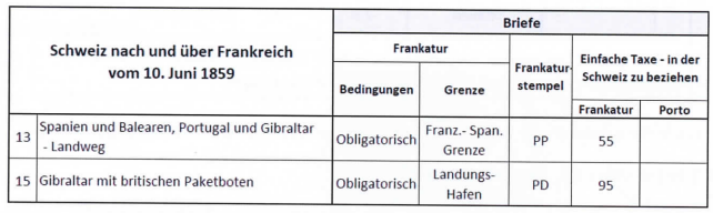 Hier finden wir die gleichen Bedingungen wie im Postvertrag von 1859 (Tabelle 10) vor, wobei das Porto bis zur französisch-spanischen Grenze im Jahr 1862 von 55 auf 50 Rappen gesenkt wurde, wie in Tabelle 13 für Portugal gezeigt wird.