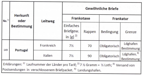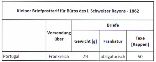 Portugal war entweder über den Seeweg oder über den spanischen Landweg erreichbar. Die Schweiz hatte zu dieser Zeit jedoch keinen Vertrag mit Portugal und war für die Beförderung von Post auf andere Vertragsstaaten angewiesen. Frankreich hatte seit 1844 einen Postvertrag mit Portugal und Spanien und Spanien unterhielt ebenfalls einen Postvertrag mit Portugal. Die Briefe mussten mit «P.P.» gekennzeichnet werden, da sie nicht bis zur Enddestination frankiert waren. Post wurde ab der spanisch-französischen Grenze unfrankiert durch Spanien an die portugiesische Grenze transportiert, wo eingehende Briefe mit 240 Milreis je 7.5 Gramm/4 Adarmes taxiert wurden, welche auf Grund nachfolgender Tabelle 11/3 Fr. oder 5 1/3 Reales de vellön entsprachen. Dies deckte die Kosten für Transit und Zustellung bis Enddestination und musste vom Empfänger bezahlt werden.