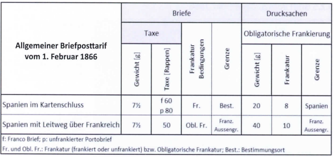 Am 1. Februar 1866 trat ein neuer Tarif mit Spanien in Kraft, welcher eine Senkung der Taxen vorsah, die in Tabelle 18 für Briefe und Drucksachen zusammengefasst sind.