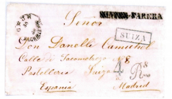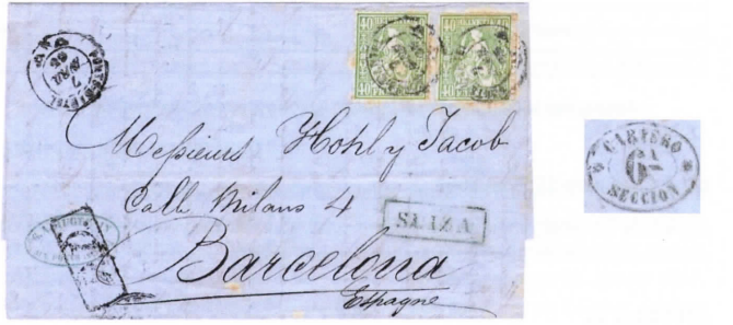 2. Briefe wurden täglich in Basel oder Genf gesammelt und in einem geschlossenen Behälter (z.B. Kuvert, Tasche) zu den Grenzbüros in La Junquera bzw. Irun weitergeleitet. Daher weisen sie nie einen französischen Grenzübergangsstempel auf.