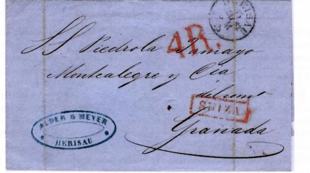 Brief der ersten Gewichtsstufe aus der Schweiz im Kartenschluss nach Granada. (Quellennachweis: Sammlung Jose Imper)