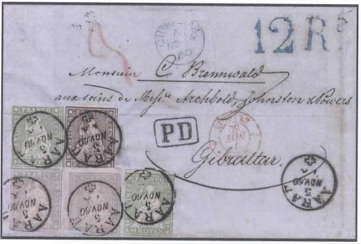 Brief von Aarau nach Gibraltar. (Quelle der Abbildung: Corinphila Auktion 2011)