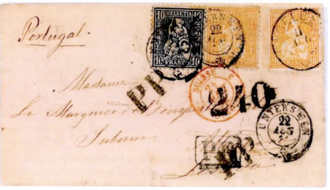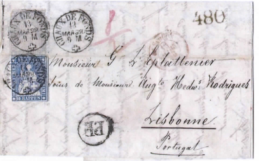 Der Brief wurde über Basel transportiert und einzig der Stempel des Grenzbüros St. Louis zeugt davon, dass der Brief über Frankreich und dann nach Spanien geleitet wurde, denn es fehlen französische und/oder spanische Transit- oder Grenzstempel. Der Brief erreichte Lisboa Ende August, und der Empfänger musste eine Taxe von 240 Milreis entrichten.