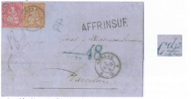 Im Beispiel von Abbildung 23 wurde der Brief lediglich mit 50 Rappen frankiert und war somit um 30 Rappen unterfrankiert. Er wurde deshalb mit dem Stempel «AFFR. INSUF.» (ungenügende Frankierung) austaxiert und das «P.P.» steht dann für eine Teilfrankierung. Ab dem 1. September 1864 galt für ungenügend frankierte Briefe nach Spanien die Regel, dass das Porto für einen unfrankierten Brief minus der verklebten Frankatur zu belasten war. Dies wurde so im Postamtsblatt 64 von 1864 publiziert. Für unser Beispiel galt also 100 Rappen (unfrankiert) minus 50 Rappen (Frankatur) gleich 50 Rappen (Taxierung). Der blaue Stempel 18 (Cuartos) zeigt die vom Empfänger zu erhebende Taxe, was etwas mehr als 50 Rappen entspricht. An der spanischen Grenze wurde wiederum der Kastenstempel [SUIZA] angebracht sowie auf der Rückseite der blaue Stempel Cda, eine Abkürzung für «Cargada» oder «Cobrada» (belastet oder bezahlt) je nach Interpretation verschiedener Autoren (Gilabert und Pedraza, 2010), welcher auf die Bezahlung der Taxe hinweist.