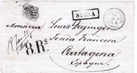 Der Brief (Abbildung 20) wurde in Wädenschweil aufgegeben und via Zürich nach Genf (16. Januar) transportiert. Von dort im Kartenschluss nach La Junquera (rückseitiger Stempel vom 18. Januar 1860) geleitet. Von dort gelangte der Brief nach Murcia (Transitstempel, 23. Januar) und erreichte schliesslich Cartagena am 25. Januar 1860. Der Brief entsprach der zweiten Gewichtsstufe, war also schwerer als 7.5 aber weniger als 15 Gramm. Er wurde daher gemäss Tarif mit 8 Reales de Vellön taxiert, was umgerechnet einem Porto von 2 Franken entsprach.