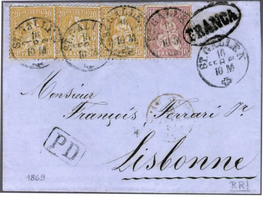 Der Tarif vom 1.11.1866 ist in Tabelle 14 illustriert. Nach der Einführung dieses neuen Tarifs konnten Briefe aus der Schweiz bis nach Portugal frankiert werden, was durch den Stempel «PD» angezeigt wurde. Die Taxe von 240 Milreis, die der Empfänger bisher entrichten musste, entfiel somit.