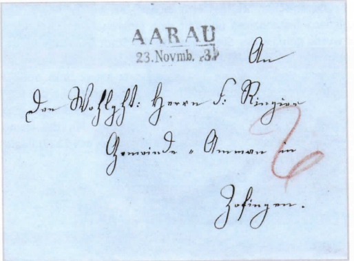 Bei Portobriefen handelt es sich grundsätzlich um unfrankierte Briefe. Dies gilt von der Vormarkenzeit bis heute. Abbildung 4 zeigt einen Brief vom 23. November 1843 von Aarau nach Zofingen. Die mit Rotstift angebrachte 2 zeigt die vom Empfänger zu bezahlende Taxe von 2 Kreuzern. Bei Portobriefen ist die zu bezahlende Taxe immer auf der Vorderseite des Briefes zu finden. Das Gleiche sehen wir auch in Abbildung 3.