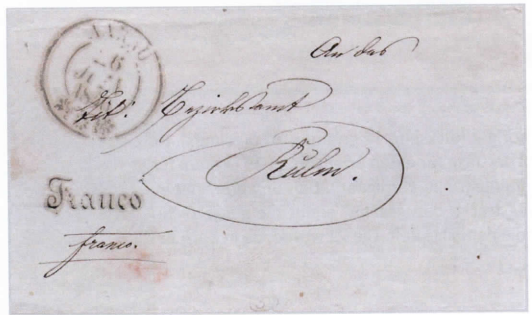 Bei Franko, also bezahlten Briefen finden sich im Normalfall keine Taxvermerke auf der Vorderseite. Dafür finden wir Hinweise darauf, dass die Poststücke «frei» gemacht wurden und damit franko sind. In Abbildung 5, der Stempel «Franco» aus Aarau. Häufiger aber ist es ein «PP» Stempel. Der Taxvermerk befindet sich hier auf der Rückseite des Briefes.