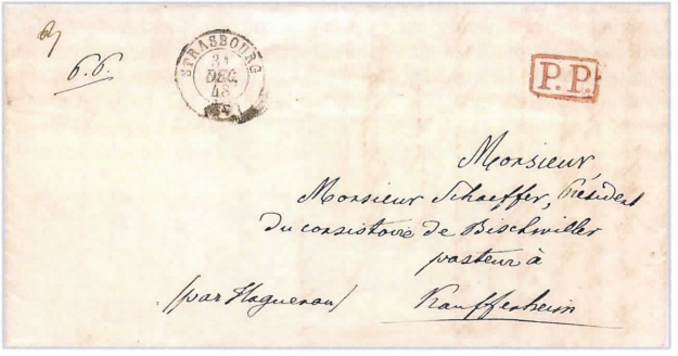 Am 31. Dezember 1848 wurde der Brief in Abbildung l von Strassburg nach Kauffenheim aufgegeben. Vorausbezahlt wie der rote Kastenstempel PP zeigt. Der letzte Tag dieses Jahres war in Frankreich auch der letzte Tag der Vorphilatelie, denn auf den 1. Januar 1849 wurden in Frankreich Marken herausgegeben.