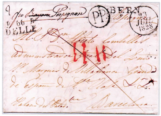 Im internationalen Verkehr kann man auch Teilfrankobriefe finden. Ein Beispiel finden wir in Abbildung 6. Am 9. Juli 1828 von Bern nach Barcelona gesandt. Damals war es zwingend Briefe bis zur spanischen Grenze freizumachen. Das wurde in Bern mit dem Vermerk «fco Perpignan» festgehalten und mit dem Einkreisstempel PP bestätigt. Dieser PP Stempel wurde gemäss des Stempelwerks der Stadt Bern von Max Keller erst auf 2 Briefen gefunden. Bei der Briefaufgabe stellte man auch fest, dass der Brief mehr als 10 Gramm wog und damit im 2. Gewichtssatz lag (2 links oben). Am Grenzübergang in Delle wurde anstelle des Grenzstempels Suisse/Delle der Stempel P.66P./Delle und der Datumsstempel vom 23. Juli 1828 geschlagen. Solche Datumsstempel wurden in ganz Frankreich 1828 eingeführt. Für die spanische Wegstrecke bis Barcelona schliesslich wurde der Brief zusätzlich mit 11 (?) Reales de Vellon belastet, welche vom Empfänger zu bezahlen waren.