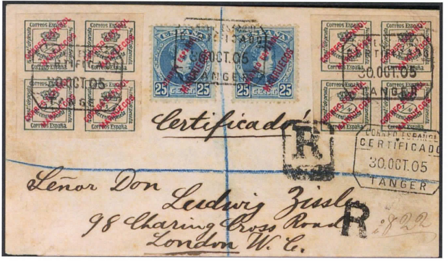 Abb.5: Einschreibebrief mit Marken für die spanische Post in Marokko, 1905 als Einschreiben nach London gelaufen.