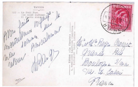 Abb.11: Postkarte aus 1950 mit der spanischen Post in Tanger gelaufen. Zwischen 1948 und 1951 gab die spanische Post originäre Marken mit der Bezeichnung «Tanger» heraus.