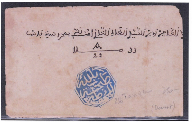 Abb.4: Undatierter Brief der scherifischen Post aus Tanger. Bis zur Ausgabe eigener Briefmarken in 1912 wurden die Briefe mit Negativstempeln «Magzen Cachet» in verschiedenen Farben markiert, um die Bezahlung des Portos anzuzeigen. Diese Stempel waren für den privaten Postverkehr achteckig, für offizielle Post wurden runde Stempel verwendet.