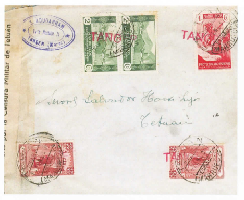 Abb.10: Brief des «kladestinen» Postamtes der Spanischen Nationalisten in Tanger von 1937. Die Briefe wurden mit Marken des von den Nationalisten verwalteten SpanischMarokko franiert und mit einem roten Einzeller «Tanger» entwertet. Die Briefe wurden dann nach Tetuan weitergeleitet, dort nochmals entwertet und weitergeleitet.