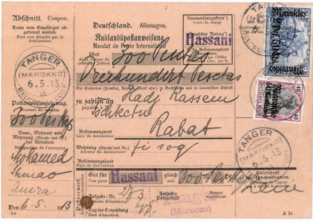 Abb.7: Inlandspostanweisung in der lokalen marokkanischen Währung «Hassani» der deutschen Post in Tanger aus 1913