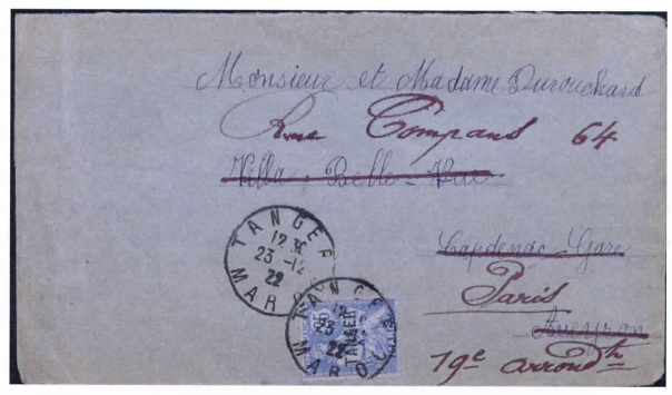 Abb.8: Brief 1922 des französischen Postamtes in Tanger mit einer eigenen Überdruckmarke «Tanger» auf einer Marke der französischen Post in Marokko.
