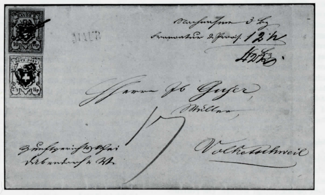 Die Postablage Maur taxierte am 2. Januar 1851 die Nachnahme für Volketswil als Brief im einfachen Gewicht bis zu l/2 Lot (?!/2 g) im I. Rayon mit 5 Rp. Porto und 5 Rp. Nachnahmegebühr. Die Entwertung erfolgte vorschriftsgemäss mit Tinte. In Zürich wurde der Brief nachgewogen und als übergewichtig befunden (13 g). Man klebte deshalb noch eine Marke zu 2^/2 Rp. hinzu und stempelte sie mit dem P.P.-Stempel. Die 2l/2 Rp. schlug das Postamt zum Nachnahmebetrag und erhöhte diesen von 4 Batzen auf 42*/2 Rp., was den vermerkten 17 Kreuzern entsprach — der Kreuzer galt Rp.