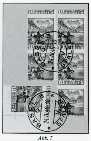 verschiebungen, Verzahnung der Marken und dergleichen die postalische Verwendung nicht immer gesichert. Geraten solche Marken in Sammlerhände, kann man kaum mehr mit Bestimmtheit sagen, ob die Marke mit der Abart zuvor am Schalter verkauft wurde, oder aber auf krummen Wegen zu ihrem Besitzer gelangte. Meistens ist teils ... teils ... die richtige Antwort. So hätte ein Philatelist die stark verzahnten Marken der letzten Ausgabe mit dem Schloss Chillon kaum (?) auf diese Art aufgeklebt (Abb. 7); doch gibt es von derselben Zähnungsabart Briefe, die eher nach «gemacht» aussehen. Fazit: Aus den angeführten Beispielen lässt sich der Schluss ziehen, dass es bei neueren Ganzstücken sehr schwierig, wenn nicht z.T. unmöglich ist, Bedarfspost als solche zu identifizieren. Es bleibt dem persönlichen Geschmack eines jeden Sammlers überlassen, wie weit er mit dem Sammeln «philatelistischer Frankaturen» gehen will. Ganz darum herumkommen wird kaum jemand, ganz einfach darum, weil es oft an sicheren Beweisen fehlt. Nachwort der Redaktion: Bei den Freioder Dauermarken erlaubt auch die Kenntnis der Zeitspanne der Bedarfsverwendung oftmals (nicht immer!), die Spreu vom Weizen zu trennen: Bei Daten innerhalb der Zeitspanne ist Bedarf als wahrscheinlich anzunehmen, ausserhalb (später, vor allem viel später) ist hingegen die Wahrscheinlichkeit gross, dass eine Sammlerhand nachgeholfen hat. Angaben über diese Zeitspannen der Ausgaben Teil und Helvetia, etc. der Jahre 1907- 42 finden Sie in der Artikelfolge «Frühdaten und Verwendungszeiten der Freimarken ab 1907».