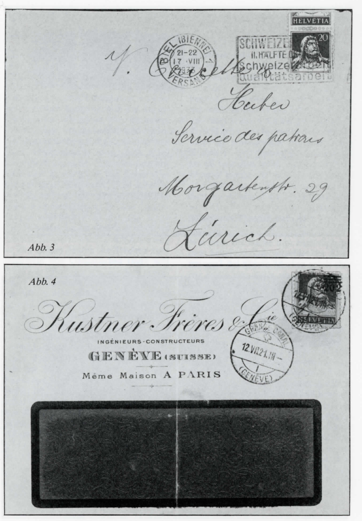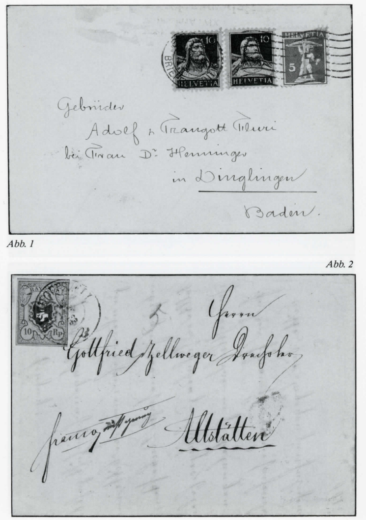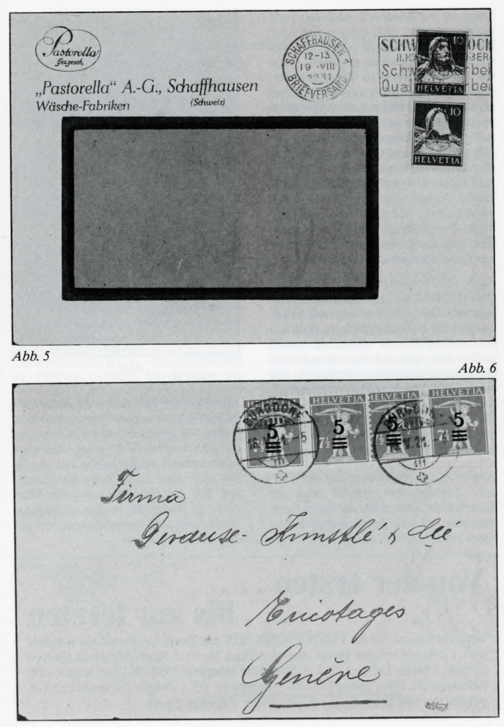 Die wachsende Flut von Neuausgaben, Ersttags- und Sonderumschlägen, Numisbriefen, Maximumkarten und dergleichen - wobei leider auch die Postverwaltungen kräftig mitmischen - zwingen manchen Sammler, sich auf die ursprüngliche Philatelie zu besinnen. Rückläufige Verkaufszahlen sind ein Indiz, dass es nicht ständig so weitergehen kann. Heutzutage ist es gar nicht mehr so einfach, gegen den Strom zu schwimmen und zu versuchen, die Spreu vom Weizen zu unterscheiden. Alle Achtung vor Sammlern, die nur portogerecht frankierte Bedarfspost in ihre Sammlung aufnehmen. Die Schwierigkeiten sind hier nicht zu unterschätzen: einerseits verstärkte sich in den letzten Jahren die Tendenz zum Sammeln von Ganzstücken (man will nicht nur Einzelmarken, sondern postalische Dokumente in seiner Sammlung haben), so dass auch scheinbar belanglose Marken auf echt gelaufenen, sammelwürdigen Briefen kaum aufzutreiben sind. Andererseits ist es manchmal oft sehr schwierig, wenn nicht gar unmöglich, Bedarfspost von «philatelistischer Frankatur»1' zu unterscheiden, wie im folgenden gezeigt wird. Als Faustregel kann etwa gelten: je älter ein Brief ist, umso wahrscheinlicher ist seine rein postalische Verwendung. Bei Sonder- und Gedenkmarken mit und ohne Zuschlag, Flugpost sowie auch bei Abarten ist die Versuchung zur Anfertigung von «gemachten Briefen» grösser als bei gewöhnlichen Freimarken. 1) Vgl. auch die Artikelfolge «Frankaturen, ihre Bedeutung und Bezeichnung in der Philatelie» von Georg Winkler; über «philatelistische Frankaturen» in Nr. 27/28 Seiten 34/35. Sehen wir uns einmal einen Brief an, den ein Vater während des 1. Weltkrieges an seine in Deutschland weilenden Söhne gesandt hat: die Frankatur von 25 Rp., bestehend aus einer roten 10 Rp.-Marke mit Teilbrustbild in der seltenen Type I und einer solchen mit der gewöhnlichen Type II nebst einem grünen Tellenbuben 5 Rp. ist portogerecht für einen Auslandsbrief. Der rückseitige Zensurstempel ist bestimmt echt, und ein Wellenstempel macht die Sache noch unverdächtiger. Nur, zufälligerweise weiss ich, dass der Absender ein Markensammler war. Also doch eine beabsichtigte «philatelistische Frankatur»? (Abb. 1) Wie sieht die Sache nun eigentlich bei dem beliebten Sammelgebiet der Abarten aus? Bei älteren Marken spielt eher der Zufall eine Rolle, ob ein Ganzstück mit einer Abart als Frankatur erhalten geblieben ist, wie bei der Rayonmarke mit dem Posthorn mit fehlendem Mundstück (Abb. 2). An den Anfang einer Rollenmarken-Sammlung möchte man den Brief mit der im Markenbild getrennten roten 20 Rp.-Marke mit Tellbrustbild stellen, einer der ersten Marken, die als Automaten-Marke Verwendung fand; er ist bestimmt goldecht (Abb. 3), im Gegensatz zu viel heutiger «Produktion» auf diesem Gebiet. Eine grössere Wahrscheinlichkeit rein postalischer Verwendung haben Geschäftsbriefe (Abb. 4 und 5): Die Aufdruckabart «202» trägt einen Vollstempel, während der Flaggenstempel auf dem ändern Brief den Teil ohne Gesicht gar nicht berührt. Der hübsche Brief mit den vier Marken mit bis in die Mitte verschobenem Aufdruck hat alle Anzeichen eines Bedarfsbriefes (Abb. 6).