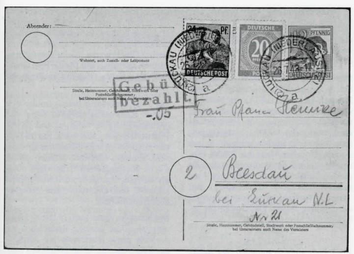 Teilfrankatur: Ein Teil der vorgeschriebenen Gebühr ist in Postwertzeichen, ein Teil durch Bareinzahlung erbracht.