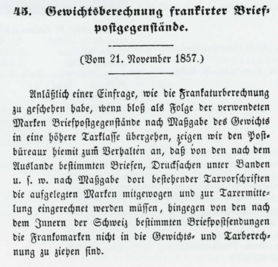 Da beim Publikum Unklarheit bestand, wie das Gewicht bei Briefen knapp um die Gewichtsgrenze zu berechnen sei, veröffentlichte die Schweizer Post im Amtsblatt vom 21. November 1857 die nachfolgende Bestimmung. Kaum bekannt sein dürfte, dass unterschiedlich verfahren wurde bei Briefen nach der Schweiz und nach dem Ausland.